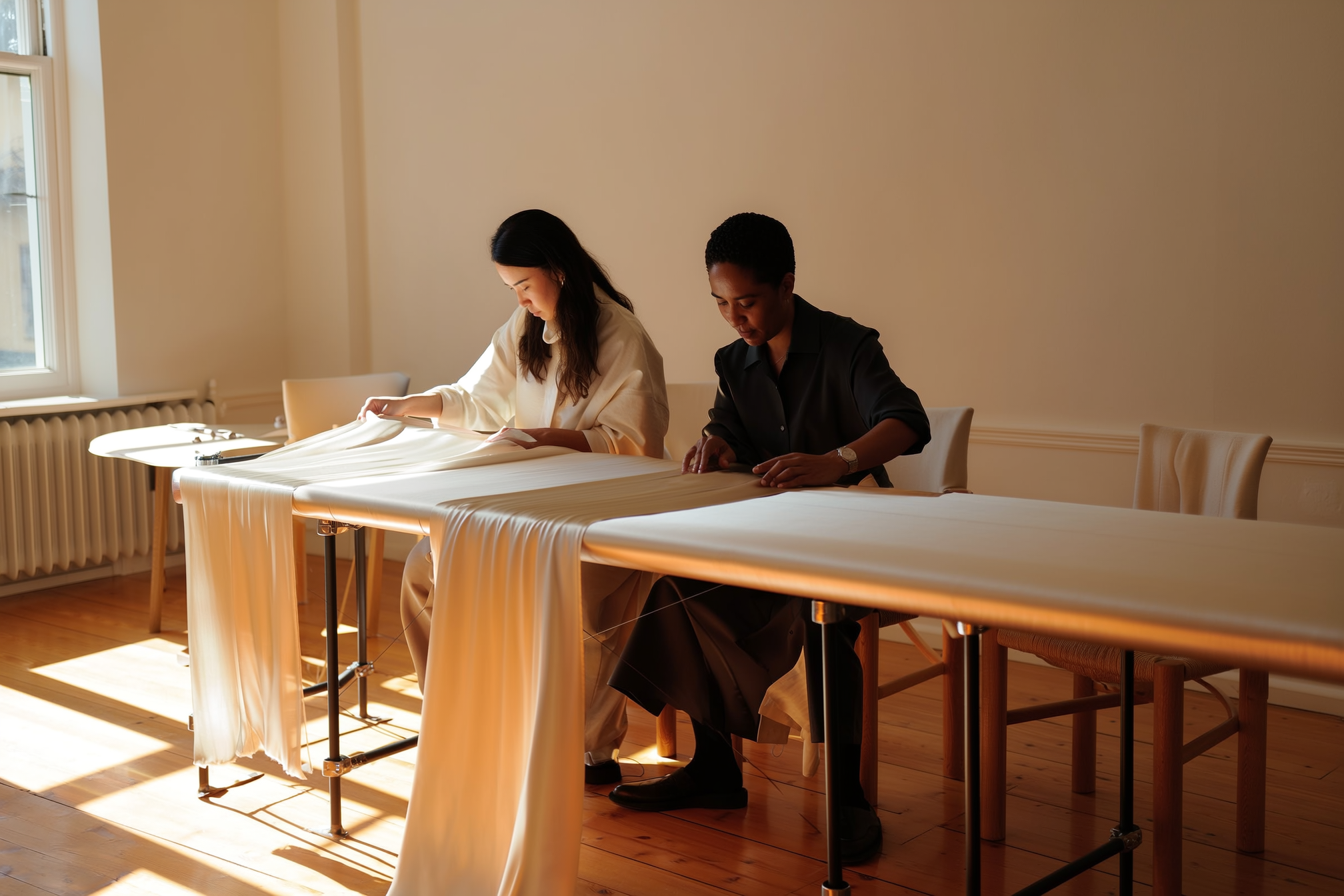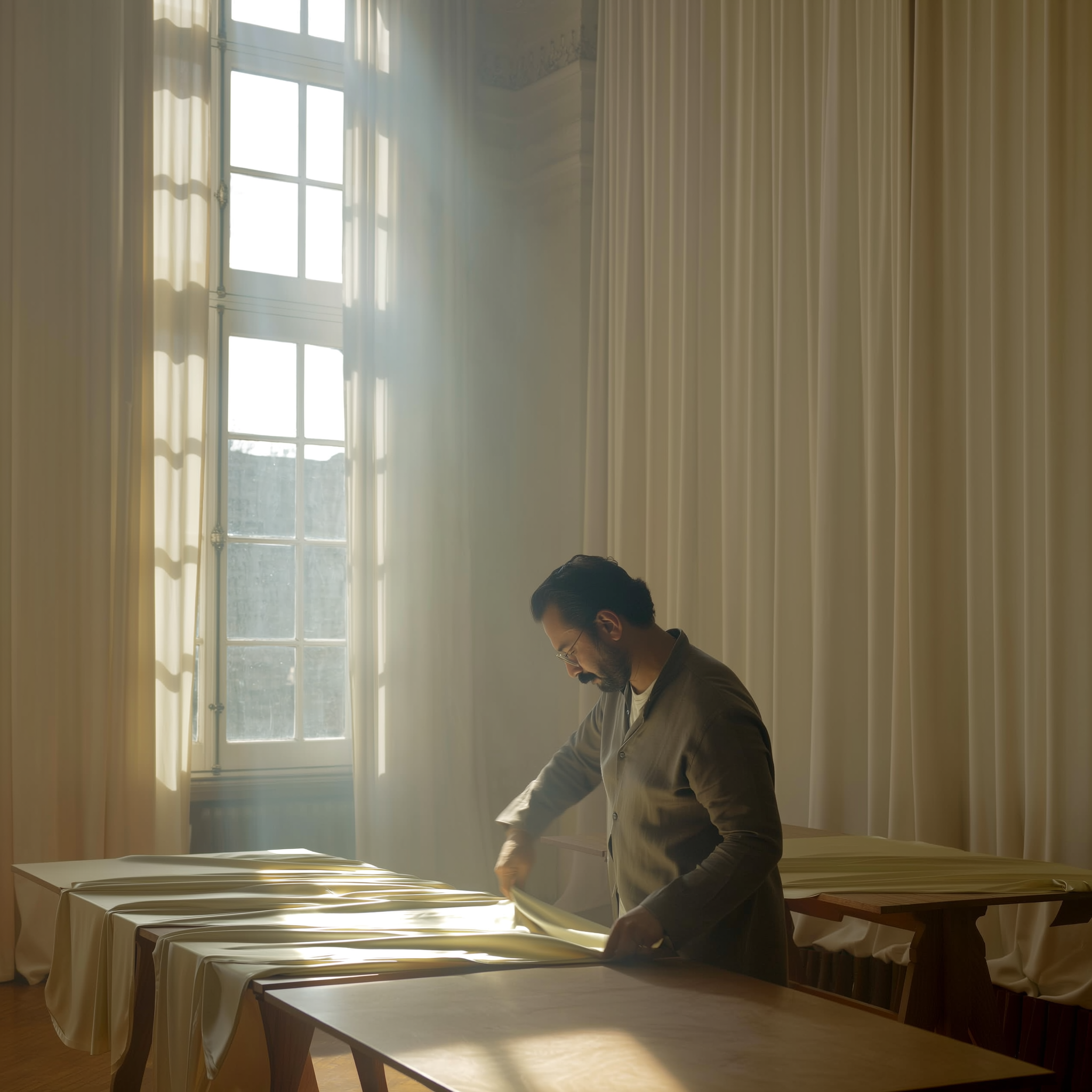 Every creation begins with a gesture, calm, deliberate, and full of care. Our artisans work with silk as one might with light itself : seeking the perfect balance between softness and structure.